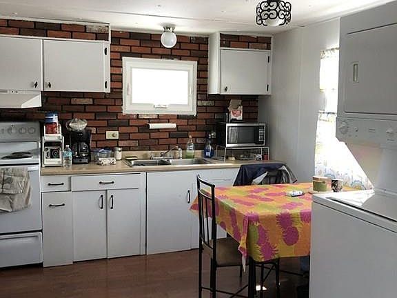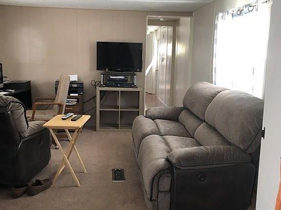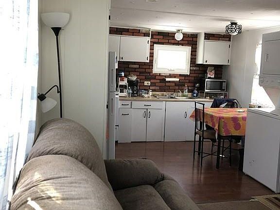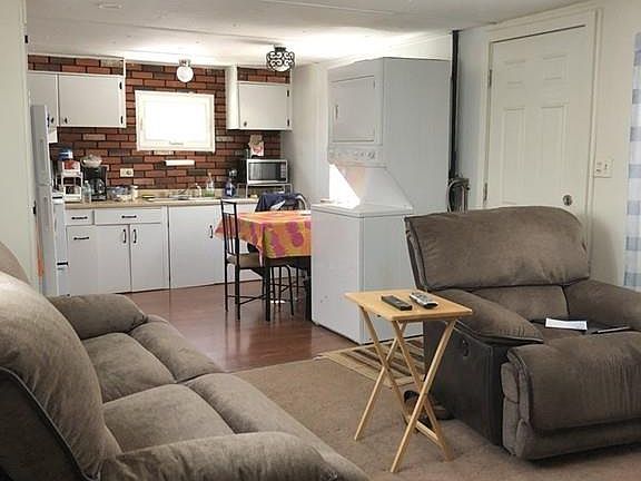 Large open living room and kitchen. One good size bedroom. There is a bonus room that could possibly be used a second bedroom. Windows and both doors replaced. Rubber roof recently done. New stove and refrigerator stay with home as well as washer and dryer. Covered porch/patio area and parking for two cars. Park fees include water, sewer, snow & trash removal. Subject to park approval. Includes storage shed. Home is Kerosene Heating which is outside. Current homeowner pays about $1400.00 for heating. Might be cash only. Hard to get financing due to age of mobile home.