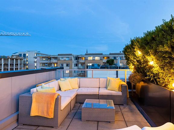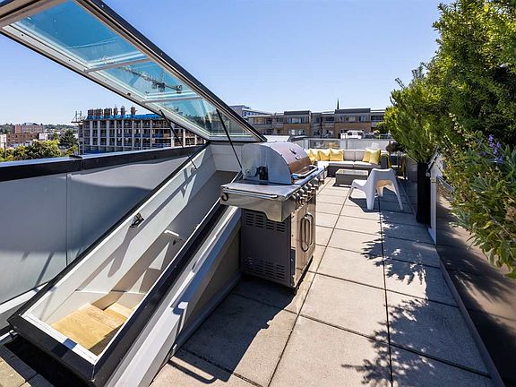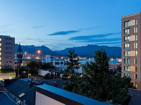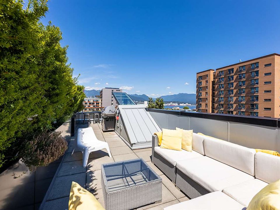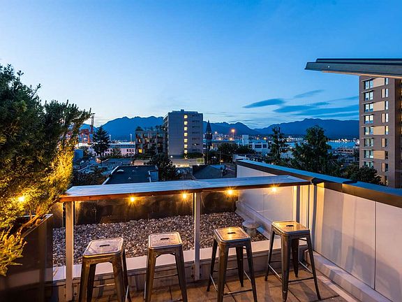 Entertaining has never been better with this exquisite corner townhome with private entrance presenting a one of a kind 322sf private rooftop deck with unobstructed 360-degree ocean & city views, perfect for outdoor entertainment & relaxation. Enjoy 1,074sf of contemporary living sprawled out over 2 floors, the main level with soaring 9'ceilings, eng. hardwood flooring, modern chef's kitchen with white cabinetry & SS appliances. Views from every principal room enhance the luxurious appeal of this unique home with 2 ample sized bedrooms on the upper floor, the master with spa-like ensuite. Den space, converted into spacious pantry, secure parking & huge locker round out this rare offering in a well maintained strata that is Airbnb friendly only steps from breweries, restaurants & more.