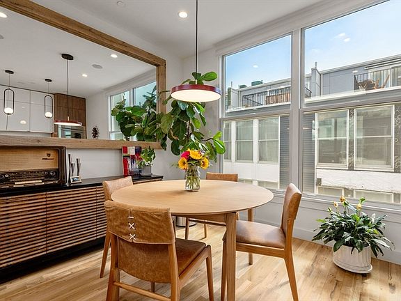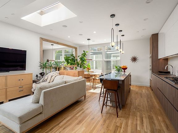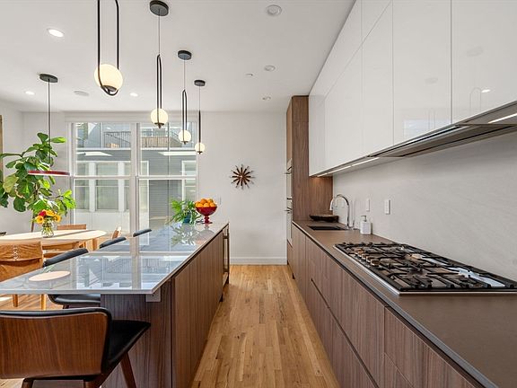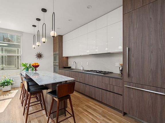 Beautifully appointed, fully renovated contemporary townhouse by architect/owner. No expense was spared in this gut renovated home. Private entrance with sintered stone flooring has direct access to private garage with Epoxy flooring, Elfa storage system shelving and 60amp hookup for future vehicle charging station. Second floor has 2 bedrooms with custom European wardrobes, Primary bedroom has ensuite spa style bathroom with steam shower and heated flooring.Upper floor features open style skylit living room/kitchen with soaring ceiling. High end kitchen features custom cabinetry, built in pantry, large kitchen island with sintered stone countertops. Thermador appliances steam oven, convection oven and beverage center. Private walk out terrace has gas hook up for barbecue and outdoor heater.