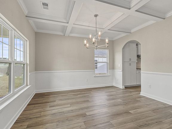 This fantastic Fairchild plan with full front porch, and an open layout has three bedrooms, two baths, and a formal dining room. Off the lovely foyer with decorative wall moldings, you’re greeted with the view of the coffered ceiling in the dining room and a stately dining fixture. Walking further into the home you’ll find the gourmet kitchen dressed with beautiful white soft close cabinetry with center island, super pantry option, gourmet appliance layout with wall mounted oven and microwave and gas cooktop. Complete with dynamic backsplash & under cabinet lighting. Looking out to open living area you have 12’ ceilings and a fireplace to warm things up in the winter. The primary suite includes a box-tray ceiling, a large 60” x 60” tile shower with frameless glass enclosure, raised double bowl vanity, and a generous walk-in closet. Walk from your primary suite to the large rear covered patio to have your coffee. Ceramic tile flooring is found in both bathrooms as well as quartz vanity tops. Bath 2 features a tile tub surround, framed mirror and upgraded soft close cabinets. Plush carpeting in the bedrooms, and luxury vinyl plank in all other living areas. Your landscaped yard will include the irrigation system. Ceiling fans in great room, primary and porch. Our 1-2-10 year warranty will give you peace of mind. Superior energy efficient construction includes 15 SEER HVAC and R-38 ceiling insulation. Photos are of this home!