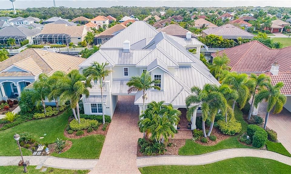 Boaters Paradise! Custom Built 6 bedroom estate home in Harbor Walk designed by Architect Don Evans and built by Bamboo homes. Home boasts endless upgrades. Beautifully appointed and immaculately maintained, with exquisite finishes and elegant touches to include: stone floors on main level, custom cabinetry and granite throughout, generous crown molding and soaring ceilings. Kitchen is a chefs delight with Monogram top of the line appliances that include a double oven with trivection technology and 6 burner natural gas stove. Home includes gym with views down the canal just off of the billiards room and next to the prewired media room. Guest suite with juliette balcony and mini kitchen will ensure they feel right at home or could be used as a well appointed inlaw suite. Many luxurious flex spaces to achieve the perfect fit with almost 6000 sq ft of living space the home offers ample space for entertaining or family on any scale. The custom pool/lanai/spa area with a LYNX grill outdoor kitchen is a welcome delight or just cozy up to the outside gas fire pit one of three natural gas fire places . All 3 floors have generous verandas to enjoy the endless sunsets. Located 2 miles from I-75 and a short distance from St Petersburg, Bradenton and Sarasota with all they have to offrer. Start living the salt life!