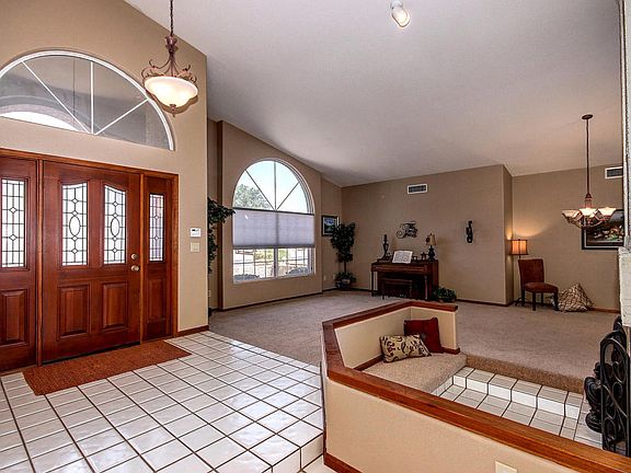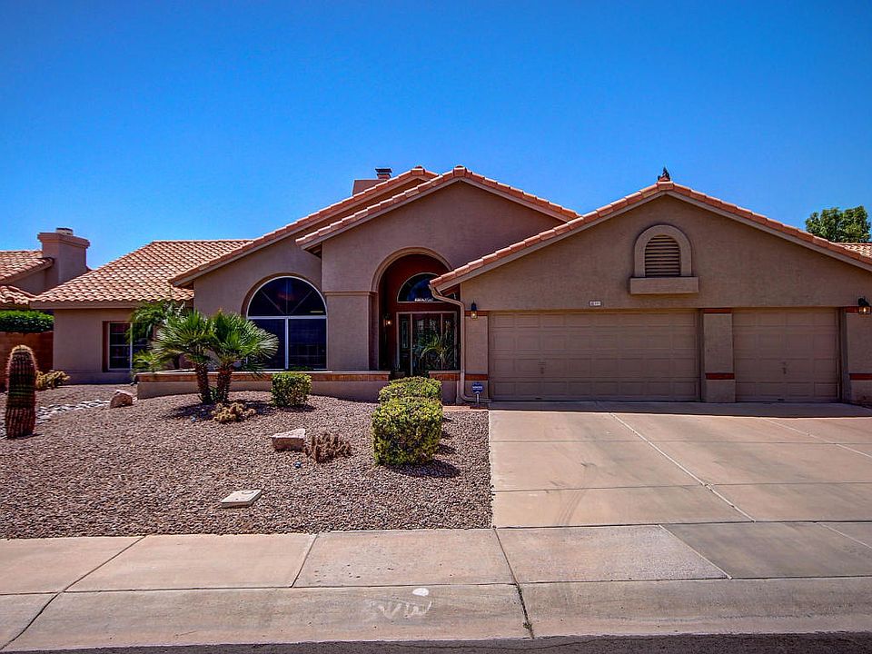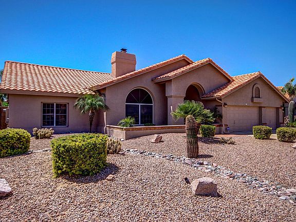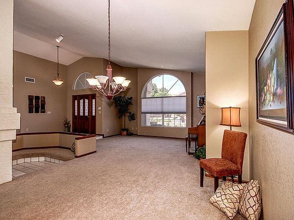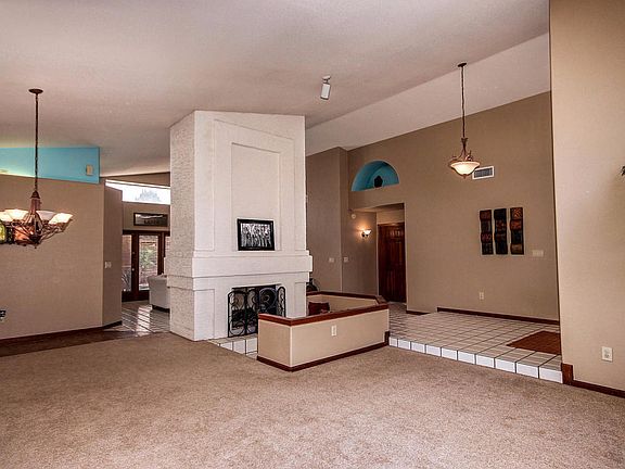 Fantastic home in the highly sought after Andersen Springs! Unique floor plan with center two-way fireplace, warm interior palette, soaring ceilings, upgraded lighting, ceiling fans, plush neutral carpet, window blinds, and tile floor in all the right places. French Doors to patio from family room. Perfect Home for entertaining inside and out. Spacious eat-in kitchen features breakfast bar, SS appliances, tiled backsplash, and oak cabinetry with hardware. Built-in desk area. Relax or entertain under the backyard covered tiled patio. Enjoy the resort style oasis with refreshing pool, spa. Exterior fireplace and fire pit with seating area. New A/C. A must see ''gem'' in the desert close to shopping, restaurants and freeways.