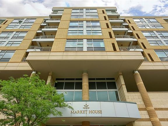 Live a stress-free, urban lifestyle in 1,826 sq. ft. at the luxurious Market House Condominium. This spacious unit has designer touches and upgrades throughout with custom wood cabinetry, 2 walk-in closets, high ceilings, large windows, and 2 balconies. The open floor plan includes living room, dining room, den and kitchen on hardwood floors and is move-in ready. Two private bedrooms are tucked away. The master en suite has a separate shower & tub, 2 closets, and sliding glass door to the exterior balcony. The kitchen is upgraded with KitchenAid stainless steel appliances, large pantry, washer/dryer utility room, granite countertops, large central island and balcony. Pet Friendly! With Market District grocery store in building, you can conveniently order groceries and have them delivered fast and easy. Maintenance fee includes annual HVAC maintenance & window washing, insurance, landscaping, snow removal. Common areas: gym, multi-purpose room & guest suite for overnight guests.