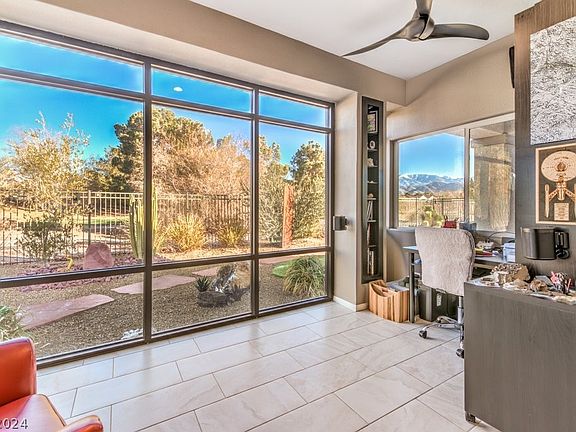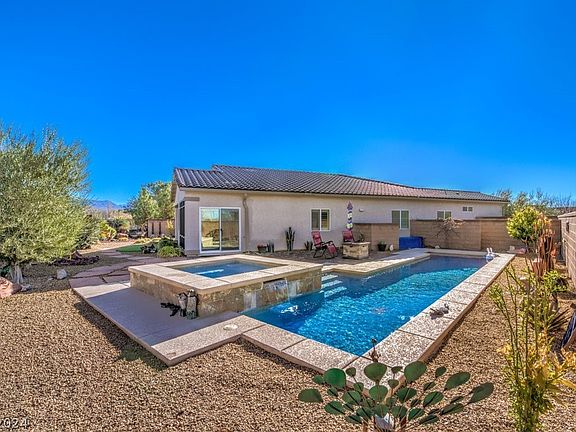 Amazing pool & spa situated on Mountain Falls Golf Course! Oversized lot w/104 feet of golf course frontage! Spa waterfalls to contemporary custom pool, cool decking surrounds, & mtn views can't be beat! Over 2k sqft home, floor-to-ceiling windows looking to golf course, & tile flooring throughout! Open kitchen w/island, pendant lights, stainless appliances, granite tops, & pantry. Primary suite has slider to patio, jetted tub w/chandelier, walk-in shower, dual sinks, walk-in closet w/custom built-ins, & separate. Open den, shutters, 3 bed, 3-car garage w/storage cabinets, & finished landscaping w/irrigation on timer. Living room has built-in entertainment center, upgraded LED lighting, & ceiling fans in 5 rooms. Extended pavers to pool/spa, gated pet area, & gutter system. Community has 18-hole golf, driving range, pro shop, restaurant, full fitness center/gym, 3 pools, 45min to Vegas, 1hr to international airport. Valley has 3 wineries, golf, gaming, & endless trails!