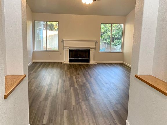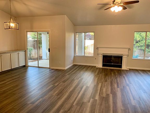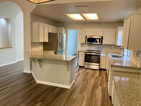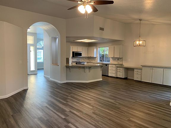 Gorgeous home including updated fixtures, this 3 bedroom 2 bathroom home is 1,867 sq ft. The kitchen has granite counters, painted cabinets, a new built in microwave, new dishwasher, Refrigerator and a breakfast bar. This home has well-laid out floor plan includes a large family room with a fire place and a dining area, new paint and flooring throughout. When you enter, you are greeted with a formal dining room with new window shutters. The primary bedroom features large closet with plenty of shelving, the en suite bathroom features soaking tub and separate sinks. The backyard has a covered patio and low maintenance landscaping. No Pets.