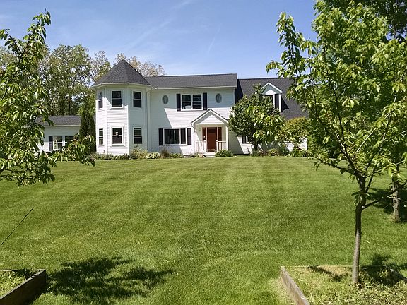 Beautiful home with a country feel on almost 3 acres with woods in the front and fruit trees (Cherry and apples). First floor Master, with Marble floors in bathroom, new large tile shower, and Jacuzzi tub. First floor has all new hand scrapped wood floors, going from the large kitchen, living, family and bed room. New fixtures and lights throughout the house. Huge Master bedroom with walk-in California style closet. Second floor loft that could be used for a Movie room, or common computer area. Two fenced in yards. New Windows and doors throughout the house. Upgraded furnace with large filter and UV lights. Office area in turret style room, with windows on three walls. Metal Amish built Pole Barn (50x100') for all your toys and workshop, with gas, water and electricity. Large 50x100' area that can be used for basketball, roller hockey or tennis court.