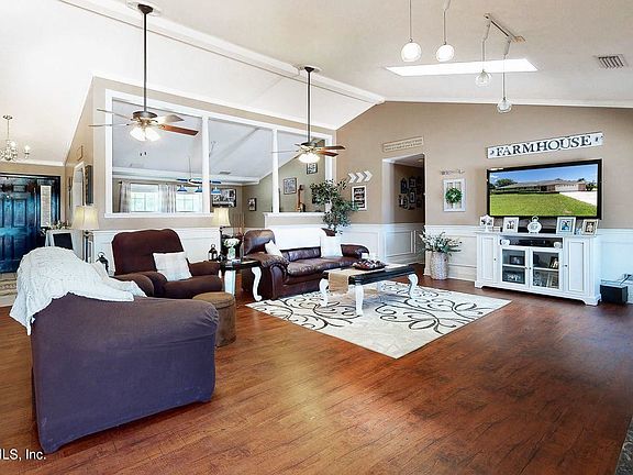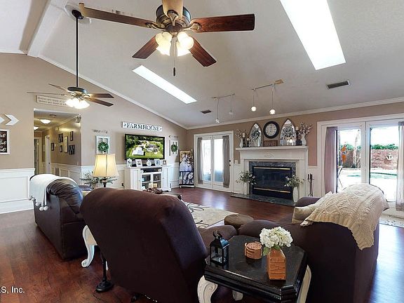 Beach style home with tropical setting around lagoon style pool. Home is open and has wood burning fireplace, formal dining room, office, eat in kitchen, large family room that looks out to the pool area. Very large detached garage work shop, additional guest house available.