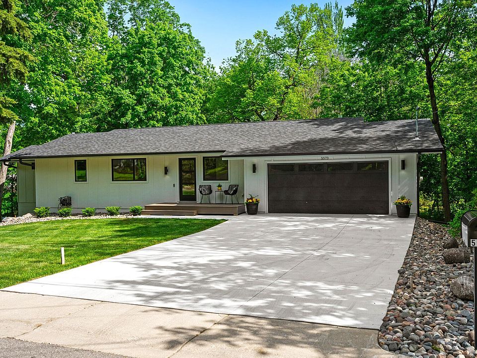 Stunning Lake Minnetonka 4/3 rambler on ½ acre lot with permanent boat slip! Custom home taken down to the studs and architecturally redesigned while keeping the mid-century modern aesthetic in mind. Open concept main level with owner’s suite and additional bedroom and bath. Living room opens out to new, maintenance free deck through 12’ sliding patio doors, overlooking dock and large, private backyard with mature trees. Beautiful kitchen with white oak hardwood floors, custom walnut veneered wood cabinets, Café appliances, dual-tier workstation sink and quartz countertops. Lower-level walkout featuring custom bar with real terrazzo tile, large family/entertainment room, 2 additional bedrooms and bath. New concrete main driveway, gravel access lane on side of home, boulder walls and fresh landscaping. Home is located on a quiet cul-de-sac within walking distance to all the award-winning Westonka schools. Details on additional upgrades in supplements.