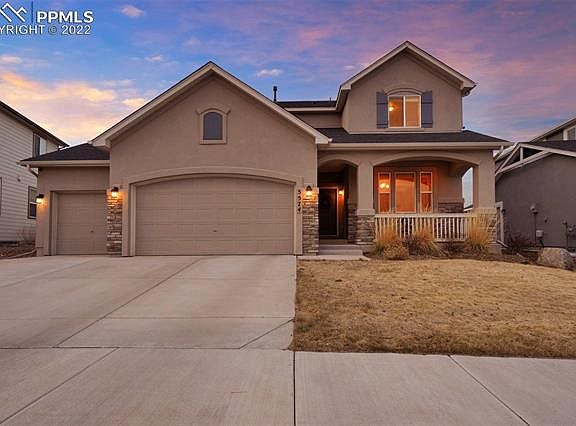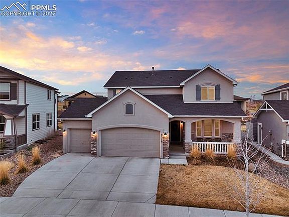 Impressive 2-story home on a quiet, 0.18-acre cul-de-sac lot in popular Wolf Ranch. Highly rated D20 schools! Bright & spacious floor plan w/6 BRs, 3.5 Baths, & insulated 3-car garage (fits a truck!) w/door openers, service door, & ceiling storage racks. This stunning, south-facing home has a covered front porch to enjoy your morning coffee. 9ft ceilings & luxury vinyl plank floors thru the main level. SMART heating/cooling throughout. Pre-wired for surround sound. Work from home in the main level office (can also be used as a flex space or dining room). The Great Rm has a gas fireplace w/stone surround & wall of windows facing the backyard. The Din Area & Gourmet Island Kitchen are off the Great Rm making this a great floor plan for entertaining. The Gourmet Kitchen boasts a counter bar w/pendant lights, white cabinets w/quartz countertops & subway tile backsplash, & a walk-in pantry. Stainless steel appliances incl a 5-burner gas range w/vent hood, a dishwasher, microwave, & oven. Walk out to a serene, covered patio (pre-wired for a ceiling fan) perfect for relaxation after a long hard day. The upper level features a private Master Suite & Spa-Like Shower Bathroom w/tile floors, a dual sink vanity, subway tiled shower w/Bluetooth speaker rain shower head, & walk-in closet. 3 addtl BRs share a Full Hall Bathroom w/dual sink vanity & tiled tub/shower. All BRs are wired for ceiling fans & have extra insulation. The Laundry Rm has tiled backsplash, custom cabinets, & a utility sink. The Finished Basement offers under stair storage, a large Family/Rec Rm, 2 BRs, & a Full Bathroom. Extras incl Cat5 wiring, window well covers, & a sec system. Wolf Ranch is a Master Planned Community that offers a Rec Center (separate fee), parks, pool w/splash park, walking trails, playgrounds, a stocked lake, & summer concerts in the park. Close to entertainment, hospitals, & shopping. Easy access to the Powers Corridor, Hwy 83, & I-25 for commuting to Denver & downtown Colorado Spgs.