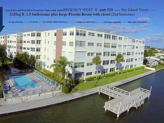 This Pristine Condo in Fantastic condition & value for "beach living". PRICE REDUCTION, $10,000 toward buyers monthly land lease fee!! In the heart of St Pete Beach, Regency west building 2, unit 529, top floor has a fantastic "lets go walk the beach" feel, and Panoramic Island and Sky views. Immaculate in presentation with 1145 sq ft, 1 bedroom, 1 full bathroom and a half bathroom in the main master bedroom with the Florida room/as a comfy close off, 2nd bedroom. The unit has been enjoyed by family for years as a second home for the family. It has a storage locker and is easy to close up with its Hurricane impact insulated windows and front door. It has not been leased. The building has 'No rent for the first 2 years of ownership rental" policy. Yet you can enjoy the amenities like Starbucks in the hotels like the Trade Winds just across the road. The Complex has 2 pools, a club house, Billiard & fitness room, Bicycle racks, 2 docks to fish. Its Land lease cuts the price in half compared to of the Gulf Front Condos. High on walking score and beach lifestyle, this clean light and open condo is absolutely Magical on its long waterfront seawall at night..... Serine and still. 2nd bedroom is actually the Florida Room. It has frosted plain sliding pocket doors. Excellent to the put the children to bed at night.