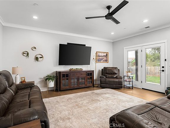 The open-concept great room is ideal for everyday living and entertaining, featuring a bright, airy layout that connects seamlessly to the kitchen and dining area. The kitchen includes shaker-style cabinetry, quartz counters, a deep sink, under-cabinet lighting, a pantry, and stainless steel appliances. The dining area opens to the backyard through two sets of doors, filling the home with natural light. The primary suite provides a relaxing retreat with dual vanities and a large walk-in shower. Two additional bedrooms and a full bath are located off the main hall, along with a versatile den that could easily serve as a home office, 4th bedroom, or reading nook. Upgrades include crown molding, ceiling fans, a whole house fan, and three stylish barn doors that add both character and functionality. Enjoy the benefits of 28 owned solar panels, which the sellers say provide significant energy savings—and even money back each month. The exterior is just as impressive, featuring two covered back patios, a charming covered front porch, and fresh landscaping with lemon, 2 orange, apricot, plum, and nectarine trees. A seasonal creek runs along the back of the property, adding a peaceful touch. There’s ample RV parking and a fully fenced yard, perfect for relaxing outdoors. Property extends to the second fence. Come see this beautifully designed home and imagine the possibilities, it’s the perfect blend of quality, efficiency, and warmth.