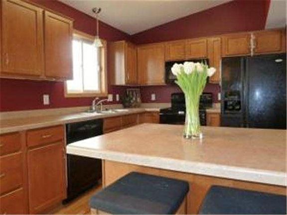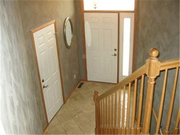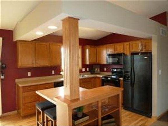 Spacious home with open cathedral ceilings, large tiled angled foyer opens to the main level as well as walkout lower level. Beautiful kitchen with Maple Cabinets and custom bookshelf cabinet separating living area from kitchen and hardwood floors. Large