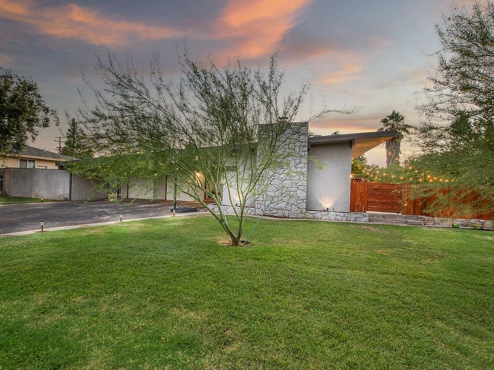 Nestled in a prestigious neighborhood and encompassing a generous 14,000 square foot lot, this exceptional mid-century modern home offers a perfect blend of style, comfort, and outdoor serenity. Boasting a large covered patio overlooking a built-in pool, a delightful side yard, and a stunning array of mature trees including Palo Verde, Jacaranda, Strawberry, Ginkgo, Desert Willow and more, this property is a true oasis. Upon entering, natural light fills the spacious living areas through multiple windows and French doors. In the front room, a stone fireplace creates a cozy ambiance. The kitchen features sleek countertops, freshly painted cabinetry, and newer appliances. Whether hosting a dinner party or enjoying a casual meal with family, the kitchen is sure to inspire. Outside, the expansive yard beckons with its lush landscaping, perfect for entertaining or relaxing by the sparkling pool. The covered patio provides a shaded retreat for alfresco dining or lounging on warm summer days. With both a 2-car carport and a 2-car garage, there is ample parking and storage. Just a half mile from Bullard High School and approximately a mile from Fig Garden Village, this home offers unparalleled convenience to shopping, dining, and excellent schools. Schedule your private tour to experience the allure of this remarkable home firsthand.