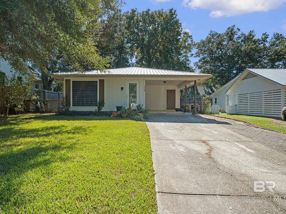 Welcome to 558 Bellangee Ave, a residence nestled in the desirable community of Fairhope. This 3 bedroom, 2 bath home is located in a sought after area, on a cul-de-sac, walking distance to the charming downtown local boutiques, dining, cultural events and so much more. Fairhope Municipal Pier, walking paths and parks offering tennis courts and pickle ball courts, are just a short stroll away- offering stunning views of sunsets on Mobile Bay. This home offers tile flooring throughout, updated lighting, bead board ceilings, custom built bookcase with an inset electric fireplace inside, while outside is fully fenced, has an open single car carport with storage room and a metal roof placed in 2020. 558 Bellangee has a whole home Rain Soft water filtration system that was just serviced in October 2023. The home owner began an addition to expand the kitchen, laundry room and create a walk in closet in the primary. This gives the new homeowner the opportunity to make it theirs. Schedule a showing today to discover the warmth and character of 558 Bellangee ave.