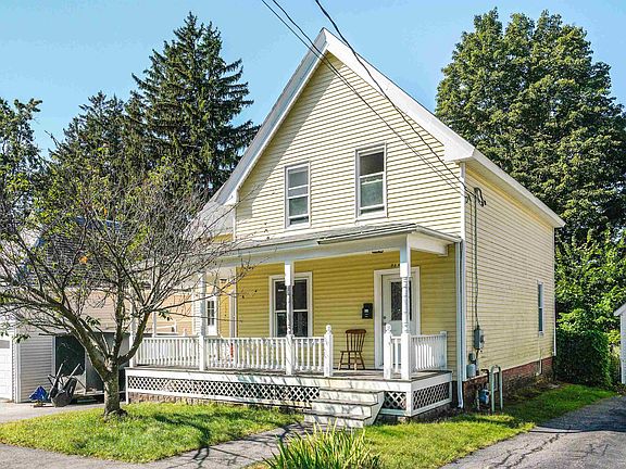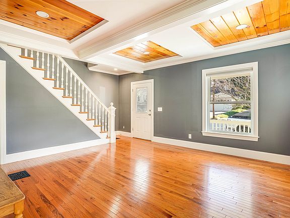 Completely remodeled 3/4 bedroom, 2 bathroom Open Concept New Englander with custom detail and gleaming hardwood floors throughout featuring 1st floor with spacious living room with gorgeous coffered ceilings, stunning new kitchen with stainless steel appliances, and granite counters open to large dining room with crown molding and slider to deck, new 3/4 bathroom, and 1st floor bedroom. The 2nd floor includes a wide hallway with hardwood floors, built-in bookshelf and sitting area, primary bedroom with huge walk-in closet, massive luxurious bathroom with double granite vanity, coffered ceiling, tile shower, and laundry area, second big bedroom with hardwood floors and office. Plus, full unfinished walk out basement with new concrete floor, insulation, and woodstove with steel liner, vinyl siding, replaced windows, public water and sewer, 1 car detached garage, and new deck overlooking fenced backyard. House has been completely renovated including, new furnace, on demand hot water, updated plumbing, and complete interior. See floorplan, 3D tour, video walk through and showing packet for additional info. Private showings welcome.