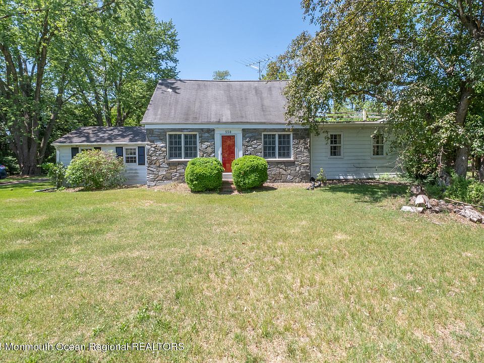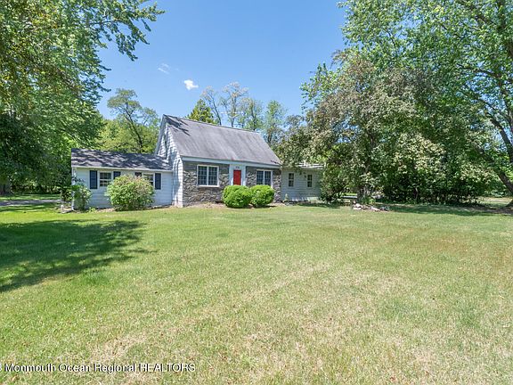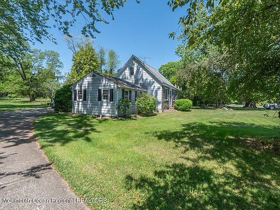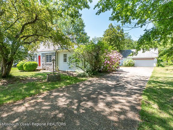 3 bedroom Cape Cod home in a private setting located in Howell but has a Freehold mailing address. Please note- this home is zoned for Colts Neck HS ! This home offers a large family room with gas fire place. Formal living room. Kitchen with separate dining area. Mud room and half bath. Also a first floor bedroom with full, recently installed full bath with shower. Upstairs is 2 additional bedrooms and full bathroom with tub. A 2 car detached garage offers 2 workshops, and a second floor full of possibilities. It has a kitchenette, full bath and 2 rooms. The property is surrounded with mature trees for privacy, and a circular driveway for convenience. Minutes from Route 18 makes commuting easy.