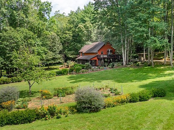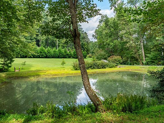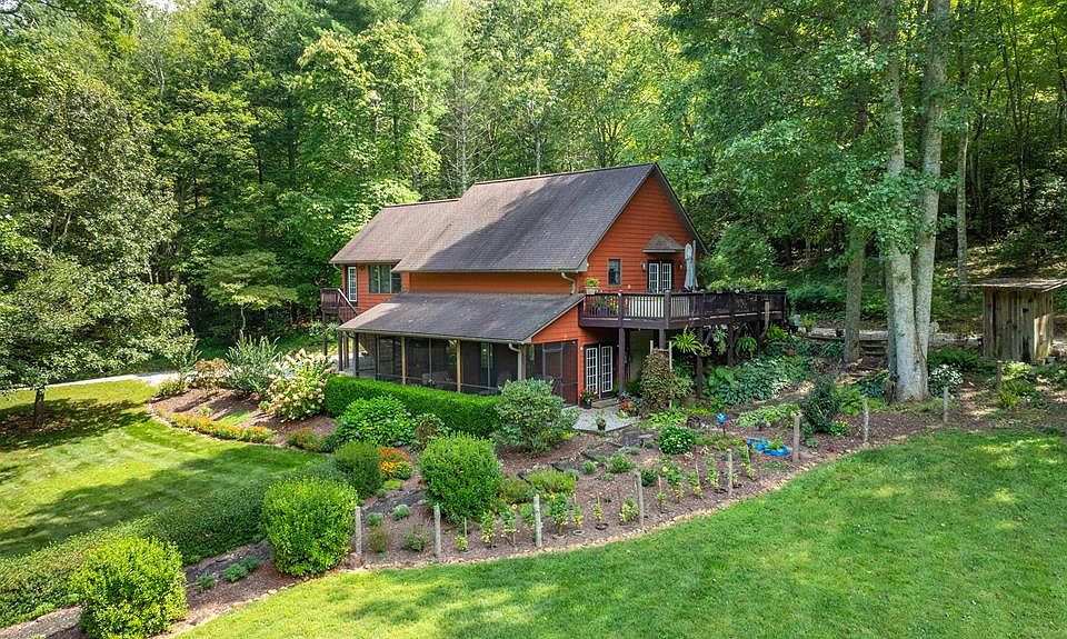Discover nearly 10 acres of serene, unrestricted property offering privacy, natural beauty, & endless opportunities! This 9.97+/- acre retreat features picturesque valley views, mature landscaping & gardens, a meandering creek, & a stocked pond. The land is thoughtfully equipped with underground power, a separate 4-bedroom septic system, an RV carport, & a storage shed with electric—ready for expansion or homesteading. The residence blends mountain charm with modern comfort, showcasing vaulted tongue-and-groove wood accent ceilings & an open-concept design. The main level offers a spacious living & kitchen area filled with natural light, along with a large primary bedroom that opens directly to the yard. A full bath & laundry are also conveniently located on the main floor. The lower level includes a bonus room & second bath with exterior access, providing flexible space for guests, hobbies, or a home office. A screened porch on this level offers the perfect spot to relax & enjoy the peaceful setting. Additional features include easy paved road access to a gravel circle drive, a double-attached carport, a chicken coop, and more—all just minutes from Highway 441 for convenience!