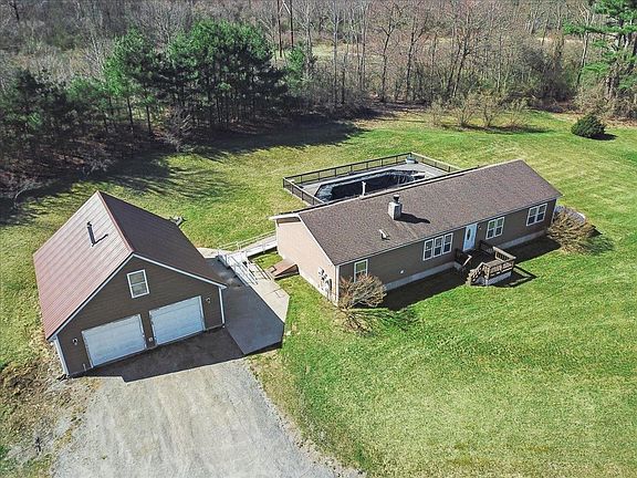 Experience the epitome of one-level living in this picturesque ranch, perfectly situated on over 10 acres of serene landscape boasting breathtaking views and fruit trees frequented by local wildlife. This gem features a spacious layout with laminate and tile flooring throughout. Entertaining is a breeze in the open concept kitchen, where the seamless flow of the layout creates a welcoming atmosphere for guest, ensuring enjoyable and relaxed gatherings, a convenient laundry room upstairs, stunning primary bedroom, complete with a spacious walk-in closet and a lavish jet tub for ultimate relation. Discover potential in the partially finished basement, offering a blank canvas for customization and expansion to suit your needs and preferences, transforming it into the ultimate space for the recreation or additional living area you are looking for. The added luxury of a large detached two car heated garage and an inviting in-ground pool, making it an ideal retreat to kick off the summer season.