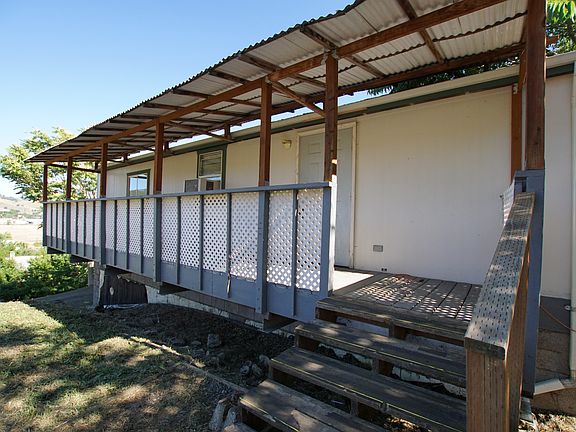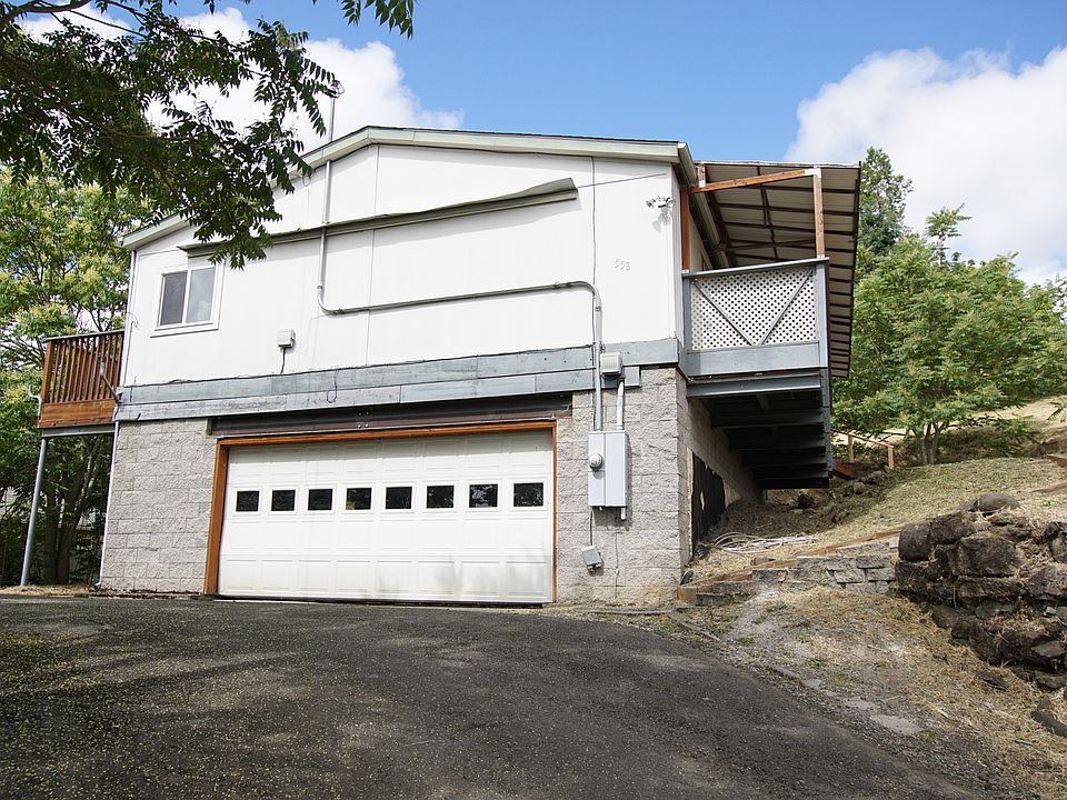 3 bed 2 bath large manufactured home with living room and master bed and bathroom. House is on a .24 acre lot for privacy. It sits up on the hill for a great view. Potential for another driveway on the flag lot side. House sits on top of a block foundation creating a huge garage.