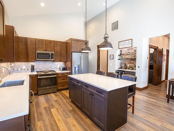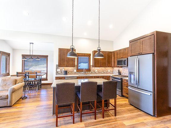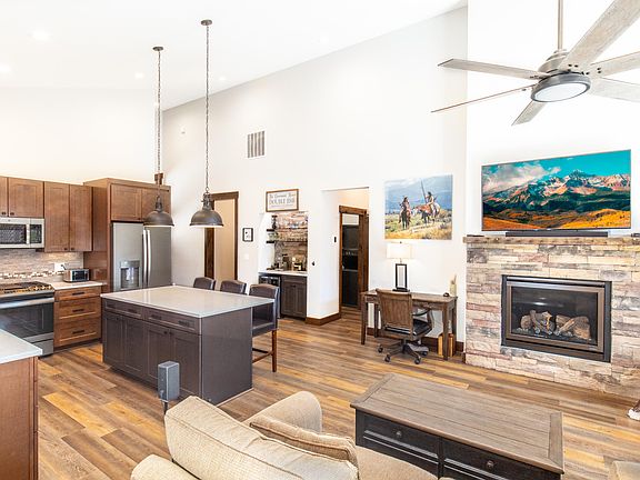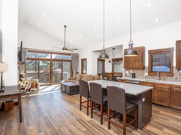 Located in the beautiful Fairway Pines Estates, this newer construction custom built home is located right on the 1st fairway of the award winning Divide Ranch Golf Course. This gorgeous home features 3 beds, 2 baths, high end finishes and numerous upgrades throughout. An open concept floor plan with high vaulted ceilings, ample natural light, and a cozy fireplace makes for a beautiful gathering and entertaining space. Quartz stone countertops and kitchen island, stainless appliances, maple stained cabinets, high-end waterproof flooring, forced air heating and A/C, and well-appointed baths round out the interior spaces. Outside, enjoy the sunshine on your custom built patio equipped with a hot tub, concrete bar, stainless grill, and fireplace that overlooks the Cimarron Ridgeline.