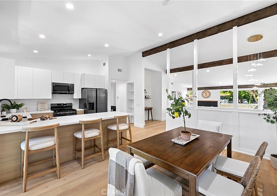 The kitchen and dining area are designed for living as much as cooking. Quartz countertops, contrasting cabinetry, and high-end appliances create a space that’s as functional as it is beautiful, while sliding doors open to a covered patio and private landscaped yard where lush turf and greenery offer a serene, low-maintenance retreat. Whether it’s morning coffee, casual lunches, or sunset gatherings with friends, every moment feels effortless and refined.