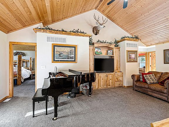 This one of a kind home sits on a 1.5 acre lot, and has all the bells and whistles. Features include vaulted tongue and groove ceilings with dormers, updated carpet, tile, and granite counters, main floor office with custom cabinets,and large mud room, a gun room and kitchenette in the basement, covered over sized back patio, concrete basketball court , and large play area with newer custom built swing set in the back yard. Mature groomed privacy trees in the front and back yard, and much more. Also included is a large 44x70 shop with a 14x70 covered awning for an rv. Shop has an exercise room and custom floors throughout.