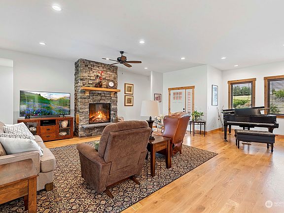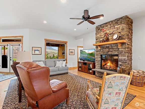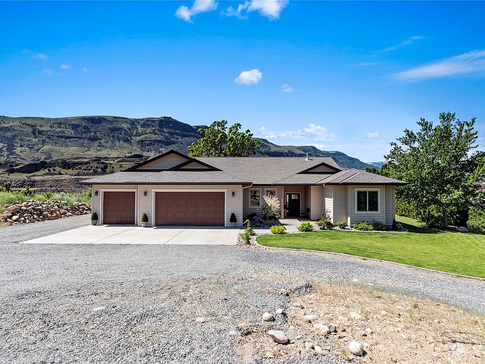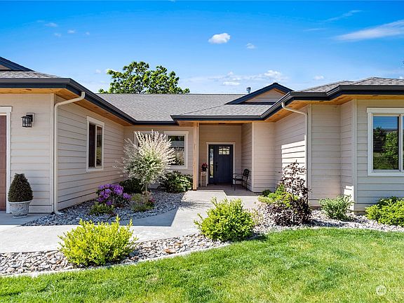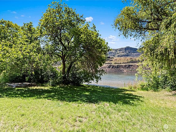 Enjoy this peaceful setting along the Columbia River. Exceptional one level waterfront home offers custom and quality finishes throughout. Enter in to open concept with stunning gas fireplace as the focal point in the living room. Kitchen has beautiful finishes including a large center island, Bosch appliances, gas range & walk-in pantry. Primary suite offers incredible views and has a private en-suite with double sinks, walk-in tiled shower & walk-in closet. 3 additional bedrooms and an office are found on the other side of the home along with a full bath and 3/4 bath. Outside is a true oasis with the covered patio, walking path to the Columbia River and private setting. 5 acre property is dividable and also offers cherry trees!