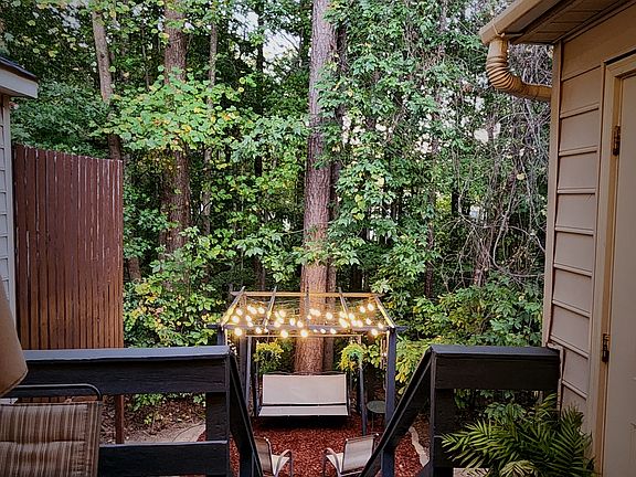 Perfect for relaxing in your backyard oasis! Centrally located, close to everything in the Triangle, and resides in a safe and well maintained community. Very spacious and recently renovated two bedroom, one and a half bath. Community pool, private garden level pergola with seating, recently painted patio with table and new umbrella included, spacious kitchen, and large living room area. Two large bedrooms, one with a 50 inch mounted TV included (can be removed by request). Washer/dryer included.