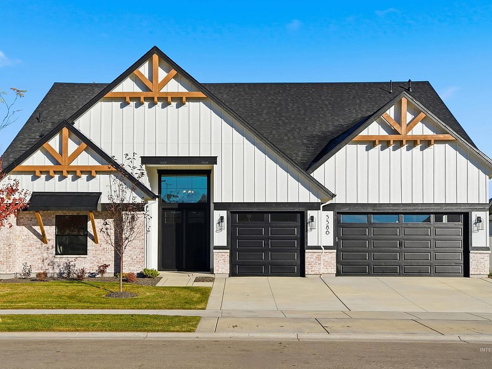 Residence 1 at Bald Eagle Point is a single-story home that features an open-concept floorplan, including a great room that seamlessly connects the kitchen and living areas. The 517 square foot covered outdoor living area connects you seamlessly to the outdoors, where you can find views of the mountains, water feature, or nearby Boise river. This home includes an outdoor fireplace and double door entry. (Photos Similar)