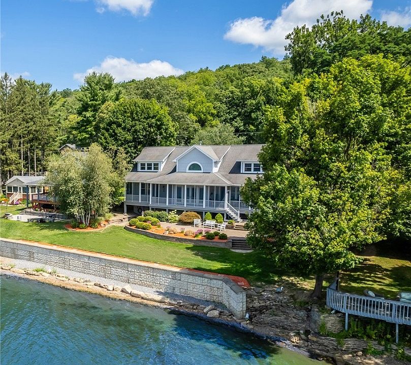 SPECTACULAR ARCHITECT DESIGNED HONEOYE LAKE WATERFRONT ESTATE WITH 100’ LAKE LEVEL SHORELINE & BREAKWALL. THIS QUINSTESSENTIAL DESIGNED LAKE HOME HAS TIMELESS ELEGANCE WORTHY OF BEING IN ARCHITECTURAL DIGEST. WELCOME TO THE LAKE WITH AWARD WINNING LANDSCAPING LEADING TO THE GRAND ENTRY! THE HALLMARK OF THIS HOME IS THE TWO STORY GREAT RM WITH ENDLESS LAKE VIEWS FEATURING AN EXPANSIVE LIVING AREA WITH GAS FIREPLACE & BEAUTIFUL HARDWOOD FLRS OPENS TO THE DINING AREA WITH A WOOD ACCENT WALL & DESIGNER KITCHEN WITH A WALK-IN PANTRY & CENTER ISLAND WITH GRANITE COUNTERTOPS, ALL WITH PORCH ACCESS! CONVENIENT ONE FLOOR LIVING...1ST FLOOR PRIMARY SUITE: WALK-IN CLOSET, PRIVATE BATH & PORCH ACCESS! PLUS 1ST FLOOR POWDER ROOM & LAUNDRY! 2ND FLOOR: LANDING OVERLOOKING THE GREAT ROOM & TWO GUEST SUITES! LIVING SPACE ABOVE 2 CAR GARAGE...WALK-OUT LOWER LEVEL! ENJOY THE LAKE LIFESTYLE WITH STUNNING PORCH WITH AUTOMATED SHADES & ENTERTAINMENT SIZED PATIO…WITH PANORAMIC VIEWS & SUNSETS! DESIGNED BY ARCHITECT JAMES FAHY..QUALITY CRAFTSMANSHIP! DESIGNER SHOWCASE DREAM HOME IS TURN KEY TOTALLY FURNISHED! OFFERS 9/6/23 1PM. SQFT TOWN OF RICHMOND C OF O -3,189 SQ FT