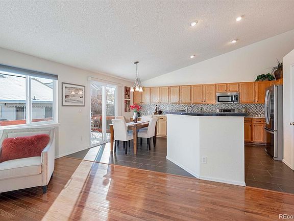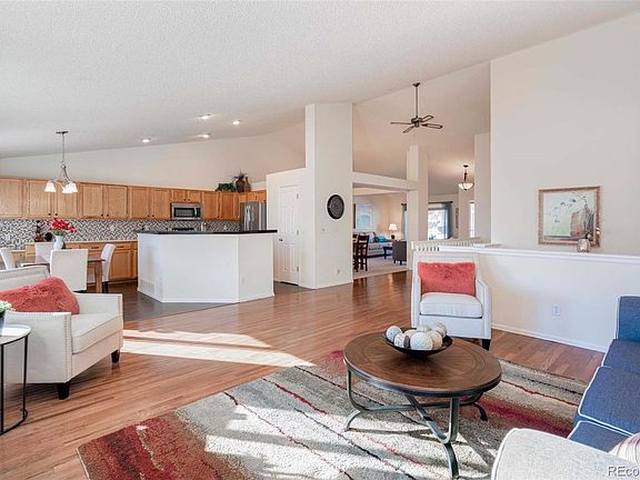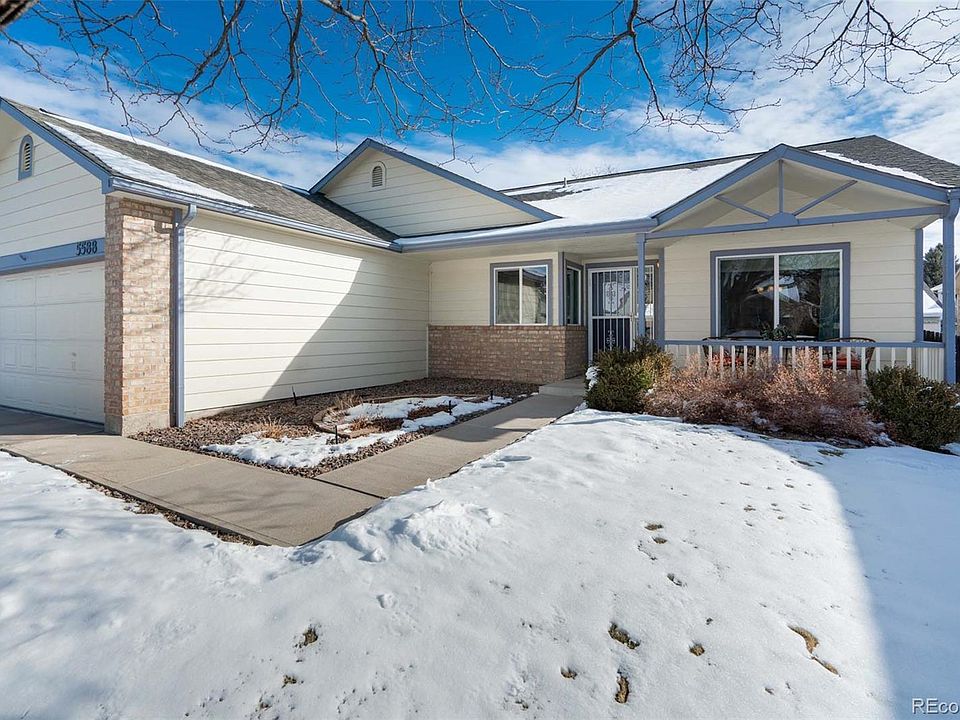 Welcome to this immaculate ranch with classic curb appeal! Beautiful brick accents and a covered front porch greet you. Gleaming hardwood floors and soaring vaulted ceilings create a warm and welcoming atmosphere. The living room, brightened by oversized windows and plush carpet, opens to the formal dining area, creating the entertainment centerpiece of this home. The open-concept floorplan begins in the family room, which is highlighted by a tile encased gas fireplace and charming built-ins. The family room flows into the open kitchen so you can always stay in on the action. An eat-in area off the kitchen is brightened by sliding glass doors offering back deck access. The kitchen is a culinary wonderland, offering light wood cabinets, ample cabinet space and bright white granite countertops. Stainless steel appliances and a mosaic tile backsplash invite your culinary creativity to flourish as you whip up a meal. Don’t miss the convenient main-floor laundry! When you’re ready to wind down for the day, retreat to the primary suite featuring plush carpets, an oversized window, and room for a seating area. The expansive primary five-piece en suite bath offers approachable luxury with a dual sink granite vanity, a soaking tub, and a private water closet. Two additional bedrooms, a full hall bath, and a powder room round out the main level. The finished basement offers additional living space alongside a full guest suite with two additional bedrooms and three-quarter bath, providing coveted separation for guests. An unfinished room offers a great space for storage or a workshop. Outside, the back deck overlooks the fully fenced yard and surrounding mature greenery. The deck offers space for an outdoor kitchen and eating area. An attached two-car garage will keep your vehicles shielded from the harsh Colorado weather. Five-minute walk to Sergeant Timothy M. Mossbrucker Memorial Park.