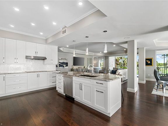 FIRST CONDO LISTED FOR SALE IN AUDUBON IN OVER A YEAR! Beautifully renovated condo with lake & golf course views in North Naples’ coveted “Audubon Golf & Country Club!” This bright & airy condo offers ample natural lighting & has been fully renovated in a stunning coastal contemporary design. Boasts an open floor plan with 3 beds + den/3.5 baths, private 2-car garage plus golf cart storage, formal dining space with a built-in wet bar, an exquisitely refinished kitchen & hand-scraped hickory hardwood floors throughout. This modernized chef’s kitchen has been updated with granite countertops, white cabinetry, herringbone white marble & mother of pearl backsplash, induction cooktop & Monogram stainless steel appliances. Spacious primary suite offers magnificent golf course views, custom closets, ample storage & an oversized shower with a rain showerhead. Delight in spectacular sunsets from the expansive screened-in lanai. Audubon is perfectly located 5-minutes from Mercato & world-class beaches, with gated/guarded entry, 18-hole championship Golf Course, tennis, pickleball, Bayside boardwalk, newly renovated clubhouse with dining & 2nd brand-new spectacular poolside club & café.