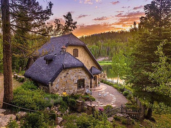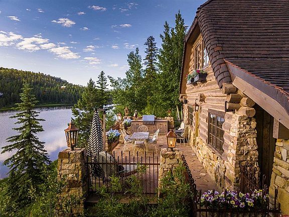 Welcome to this iconic lakefront home in Durango, Colorado located down a secluded winding road through the aspen and pine trees of the San Juan Forest, perched on the edge of Columbine Lake and only one mile to Purgatory resort. This exceptional property presents a captivating transformation of the original log cabin into a breathtaking French country cottage, seamlessly blending rustic charm with elegant sophistication. Nestled amidst the awe-inspiring mountain landscape, this 2,228 sq ft home offers unparalleled views of the serene lake from nearly every room. Adorned with authentic French antique fixtures and iron work, artisan stone and tile, and a leaded glass Dutch front door handmade by Durango craftsman Doug Christie. The custom French tile roof, where each tile was carefully sourced and imported from France, including the installer, adds an authentic touch of European elegance. The exterior boasts intricate stonework and detailing, iron railings crafted by Durango artist Kelly Hurford, and custom wood windows further accentuating the timeless beauty of this home. This distinctive home is warm and inviting, yet roomy enough to feel luxurious. With two bedrooms offering lake views, as well as a spacious loft that comfortably fits three twin beds, there is ample room to accommodate guests and create cherished memories. The guest bathroom is a true masterpiece, featuring a hammered copper tub where you can unwind and soak away the cares of the day while admiring the craftsmanship of the custom vanity and decor. The upholstered ceiling in the primary suite adds a touch of opulence and softness to the room, while the stone flooring, laid in a herringbone pattern, creates a timeless and sophisticated ambiance. A cozy alcove is thoughtfully designed for the bed and strategically positioned to provide stunning views of the lake through oversized windows. The custom stone shower welcomes you into the thoughtfully designed primary bathroom. French-styled vanities exude elegance, while beautiful built-in storage ensures ample space for all your essentials. Custom wall paintings add a touch of artistic flair, elevating the ambiance and further enhancing the serene and calming atmosphere of this space. Completing the primary suite is a large walk-in closet with ample built-in shelving to accommodate your wardrobe needs and organize your belongings with ease. Enjoy cozy evenings with in-floor radiant heat or the captivating stone fireplace in the spacious and open living room with vaulted ceilings and the beauty of the wood from the original cabin surrounding you. The open floor plan seamlessly connects the living and dining room, allowing for effortless flow and a sense of togetherness. As you move through the space, your attention will be drawn to the gourmet kitchen, a culinary masterpiece that exudes both style and functionality. Custom stone flooring sets the foundation, while intricate tile details at every corner add a touch of artistry and sophistication. The custom vent hood is a stunning focal point that commands attention and is expertly accentuated by the custom cabinetry. The large windows create the perfect space to cook, entertain, or simply enjoy your morning coffee. Step outside onto the patio and immerse yourself in the tranquility of the lake while enjoying the abundant wildlife including Canadian geese, moose, and hummingbirds. The patio features a built-in Dacor gas grill, allowing you to savor delightful al fresco dining experiences while relishing the stunning backdrop of the lake and surrounding landscape. Stroll through the gardens and enjoy countless perennials conveniently watered with a drip system connected to a cistern. One of the most remarkable features of this property is the direct and private access to the water with over 350 feet of waterfront property. Imagine mornings spent on the shore, paddling out in your kayak or paddle board.