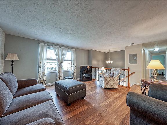 Make the move into the desirable community of Holiday Park! Buyers will love this nicely maintained split level home with 3 bedrooms and 2.5 baths. This sun lit home has many desirable features including a newer eat-in kitchen, a Master bedroom ensuite, and a finished lower level family room with gas fireplace, big screen TV, and half bath. The living and dining room space is an open floor plan, with a skylight in the dining room. Open the sliders from the dining room and step outside to enjoy the serenity of the water feature just off the rear patio. Or, take advantage of the large back yard (with shed); perfect for pet, picnics and play. The 1 car heated garage can be converted to accommodate 2 cars, if desired, by moving the laundry area. Solar outdoor lighting. New 2024 roof. Convenient to shopping, restaurants and entertainment with great access to Routes 286, 22, 376 and 76. Home warantly included.
