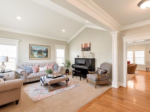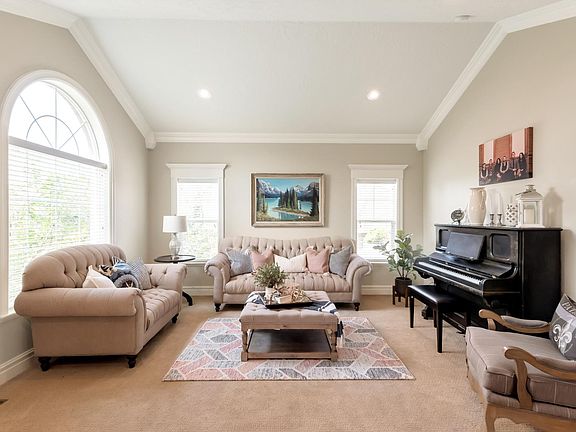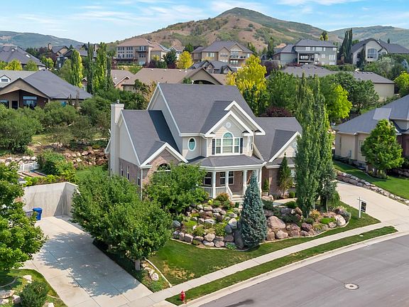 Custom-designed home with timeless design in the foothills of Eaglepointe Estates. Loaded with upgrades and special features. Beautiful custom landscaping and a front porch perfect for viewing valley sunsets. Beautiful millwork throughout including crown molding, wood-cased windows, and tongue & groove ceilings. Solid hardwood floors on main floor. Large kitchen is made for entertaining with 2 ovens, a large island, and large eat-in spaces. Additionally, there are many extra built in cabinets and a large walk-in kitchen pantry. Light & bright inside with formal living and dining as well as great room off kitchen. Owner's suite features valley views, vaulted ceilings, a sitting area, large jetted tub and over-sized closet! Fourth bedroom on second level is oversized and perfect for a bunk room! Basement is walk-out and has plenty of storage. Basement ensuite bedroom is oversized with full bath. Secondary washer/dryer hook-ups in the basement closet. Located in a quiet cul-de-sac. Plenty of open flat yard space and a second backyard level with a fire pit and fruit trees including peach, nectarine and apple trees. A yard like this is a rare find in the hills of NSL! Afternoon/evening shade is perfect for backyard BBQ's. Only 15 short minutes to downtown Salt Lake and the airport. Minutes to Eaglewood Golf Course, hiking/bike paths, parks, local tennis/swim club and more.
