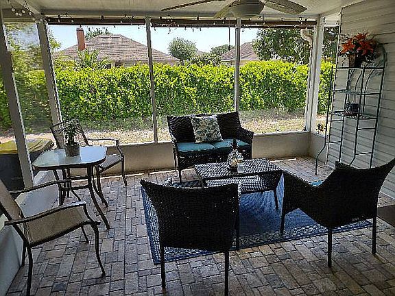 This recently renovated, spacious 3 bedroom, 2 bath home awaits your personal touch. There is newer tile flooring in most rooms which allows for easier maintenance. All three bedrooms are newly carpeted and each has a walk in closet. The large master bath offers a handicapped double seated shower, plenty of counter space and cabinetry. All lighting, fans and appliances have been recently updated and replaced. A private, tiled screen room offers morning sun only as it overlooks your spacious private yard located on the periphery of this community. The air conditioner and roof are newer. There is plenty of storage in your shed as well as many little nooks and cabinets throughout the home. There is plenty to surprise and please you in a house that will not disappoint.