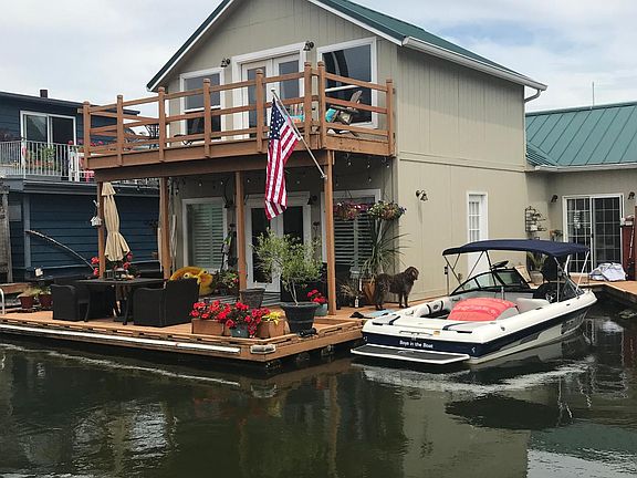 Gorgeous floating home. With boat dock Master bedroom bath and large walk-in closet upstairs with deck. Easy commute to PDX and airport. Plantation shutters wood look laminate flooring. Owner pays trash waster sewer garbage