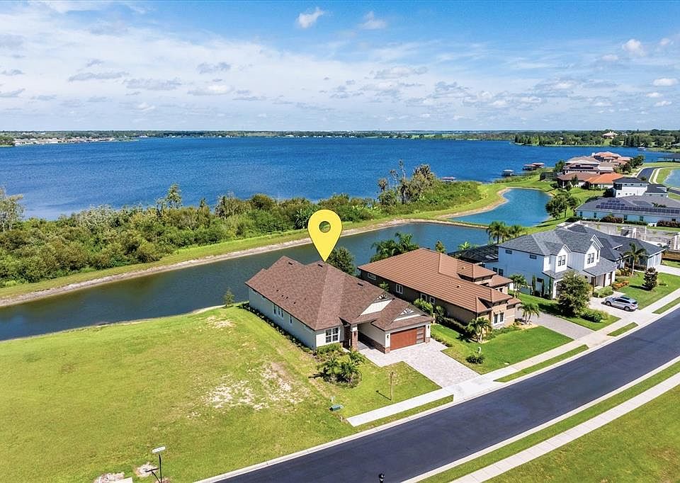 Welcome to this brand-new, waterfront, custom-built luxury home offering exceptional craftsmanship, high-end finishes, and thoughtful design throughout. Nestled in a prime location with breathtaking views of the canal and Lake Van, this home delivers spectacular sunsets and serene waterfront living. Featuring a highly sought-after in-law suite with a private entrance and kitchenette - perfect for multi-generational living, guests, or a private office setup. Step inside to a spacious and open floor plan featuring 3 bedrooms, 3.5 bathrooms, and premium details at every turn. The gourmet kitchen is a chef’s dream, boasting premium quartz countertops, a matching quartz backsplash, a massive center island, top-of-the-line appliances, custom high-end cabinetry, and a spacious walk-in pantry with built-in shelving. Whether you're entertaining or cooking a quiet meal at home, this kitchen is designed to impress. The open-concept great room features soaring 12-foot vaulted ceilings and opens to a large lanai through elegant French doors, providing the perfect space to relax and enjoy stunning sunset views over the water and the wooded nature preserve. The formal dining area is framed by a beautiful 12-foot tray ceiling, adding depth and character to the space. The primary suite offers a luxurious retreat with a spa-inspired bathroom, complete with a soaking tub, large walk-in shower with a rain shower head, and an oversized walk-in closet featuring custom built-ins. The laundry room is equally impressive, with custom cabinetry, a storage wall, and a sink for added convenience. Expertly crafted with attention to detail and thoughtfully designed for today’s lifestyle, this custom home offers timeless style, high-end amenities, and exceptional waterfront living. Don’t miss your chance to own a Dream home in a one-of-a-kind, upscale community with unparalleled Resort-Style amenities. Enjoy multiple Tennis and Pickleball courts, a Basketball court, 3 Pools, Access to 3 Lakes, Boat Ramps, Fishing docks, RV and Boat Storage, a large Fitness center, Sauna and a beautiful clubhouse. Engage in community activities like game nights, social gatherings, and Live Music events, all thoughtfully designed to bring neighbors together, have fun, and create lasting memories. Perfectly located between Tampa and Orlando with easy access to I-4, you’re just a short drive from Universal Studios, Disney Parks, Legoland, premier shopping, dining, and much more!