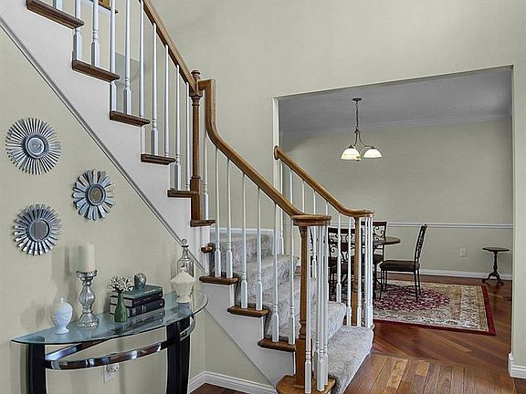 GREAT NEW PRICE !!! This spectacular two story home features an impressive two story foyer with Brazilian Cherry Flooring that extends through out the formal dining room, sitting room/den, main bath, into the impressive great room with a gas fireplace, along with breakfast and kitchen area. This home has neutral interior colors and a crisp white designer kitchen with granite countertops, the centered island has a gourmet stainless gas cooktop, built in microwave above the convection oven in stainless from Bosch and large pantry.. The Master Suite is located on the second floor and has a luxury bath, separate sink/vanity, jetted garden tub and separate shower. 3 additional bedrooms, a full bath. The lower level includes a recreation room with built in custom shelving, game/tv area and a custom wet bar for plenty of entertainment