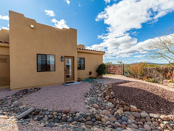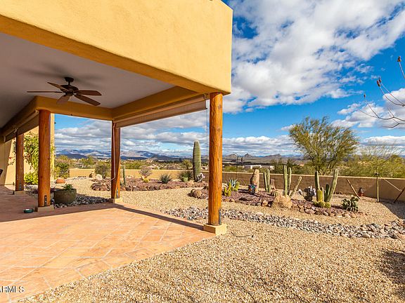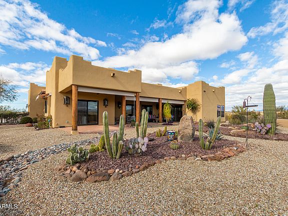 This Custom Santa Fe Home is truly a work of art! Featuring: custom entry gate, oversized front door, bee-hive fireplace, bookcase handcrafted from a 1800's Spanish Hacienda, custom handcrafted matching kitchen cabinets, Wolf gas stove, artwork backsplash, Vulture Peak Views, handmade saloon pantry door, skylights, ceiling beams, Wrought Iron & Spanish Tin chandeliers, a bonus room w/ exit, 2 Patio Areas, hand troweled custom finished walls, mood lighting, custom bath sinks, master bed w/ separate exit & peaceful mountain views, walk-in shower w/ skylight, guest suite walk-in closet, en suite w/ separate exit that leads to tranquil starry nights, home office with exit to patio, 3 Car Garage & Workshop big patio w/ custom tile mural, fenced yard overlooking incredible Wickenburg views! EXPANDED DESCRIPTION: This one-of-a-kind Santa Fe Territorial Custom Home is truly a work of art. As you walk up to the custom gate and enter the hand brushed oversized blue door you are greeted by an open great room with a warm fireplace. Your eye immediately catches the Custom Book Case created from an 18th Century Spanish Hacienda Door. Walk into the chef's kitchen and you will find custom hand crafted cabinets that compliment the book case. The large Wolf gas stove with proofing oven catches your eye along with the artwork. The pantry features a handmade saloon style swinging door and a skylight. As you step toward the bedrooms you find beautiful beams on the ceiling, wrought iron and Spanish Tin chandeliers and a home office with a separate exit to one of your two patio areas. Now you notice the hand troweled custom finished walls, the mood lighting and the guest bathroom with custom sink. The master bedroom has a separate exit to the main patio and beautiful views overlooking the peaceful mountains. The main bath has a walk-in shower with skylight and an expanded closet. The guest suite has a walk-in closet and the en suite has a separate private door that leads to starry nights and tranquility. As you step outside your immediately notice the craftsmanship and custom tile mural. Your fence yard overlooks some of the best views in town. The three car garage features a custom workshop area and a separate exit to another amazing patio and garden area. This amazing home has several remarkable features that will appeal strongly and adds hugely to the home's value, and should not be overlooked! Priced below recent appraisal, great location, incredible Wickenburg Views and one-of-a-kind features make this home a winner! Some furniture and decorations maybe available on a separate bill of sale.