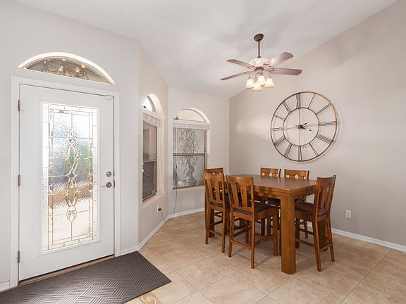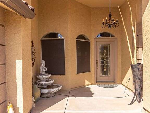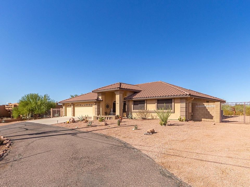 Move in ready! 3 bedroom 2 bath, 3 car garage home with awesome views of the Superstitions. High ceilings, Soft color palette, beautiful pillars, and built-in niches for formal living & dining. Carpet & tile in all the right places. Open concept floor plan for the kitchen, dining, and family room is a perfect entertaining space! The stunning kitchen has a plethora of custom cabinets, gorgeous granite slab counters, island w/seating for 6, gas cooktop, wall mount oven & microwave, and a custom etched glass door to the walk-in pantry. Generous sized bedrooms have plush carpeting & ceiling fans. Master has a private entrance, full bath with double vanity & walk-in closet. The serene backyard has a covered patio, built-in BBQ, above ground spa, and majestic desert & mountain views