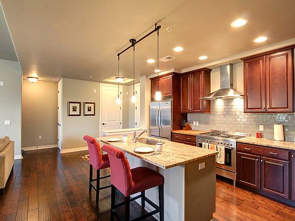 Fabulous 2 Bedroom, 2 Bathroom condo in desirable Littleton neighborhood2014;just minutes to the Littleton Light Rail! Your future home offers secured entry and 2 deeded, heated, covered parking spots and dedicated storage unit! Hand-scraped wi de-plank hardwood flooring throughout, except in bedrooms, where there is carpet. Open floor plan has 10-ft ceilings, ample closet space, Living Room with gas fireplace, Dining Room, and Gorgeous Kitchen. Kitchen features granite-slab countertops, decorative glass subway tile backsplash, stainless-steel appliances, and large center island with additional seating and storage. Master Bedroom has Juliette balcony, coffered ceiling, private 5-piece spa-like Bathroom, and large walk-in closet! Laundry Room in the unit! Beautiful granite and tasteful decorative glass tile finishes throughout! Very spacious covered patio with gas grill! Gorgeous home! Fantastic location-walk to historic downtown littleton! Call now to schedule your personal showing!