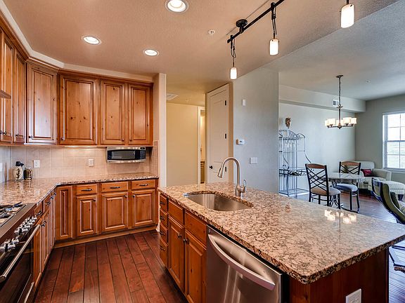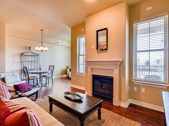 Beautiful luxury condo located in the heart of Downtown Littleton. Gorgeous hardwood floors, granite countertops, hickory cabinets and high end finishes throughout this stunning west facing unit. Master suite includes balcony access, beautiful five piece master bathroom, and amazing & huge custom California closet. Large west-facing balcony with retractable awning is plumbed with a natural gas line for a grill and perfect for entertaining and enjoying sunsets. The open concept kitchen is equipped with stainless steel appliances, a 5 burner gas range, and a fabulous island. In unit laundry with high end washer & dryer included. Two parking spaces (and storage unit B-9) in secured, underground garage. Walk to all that Downtown Littleton has to offer and the Littleton Light Rail Station. Do not miss out on this opportunity at low maintenance luxury living!