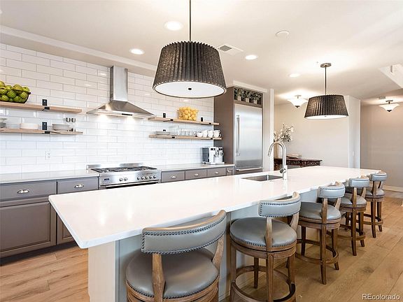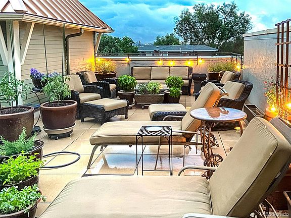 Enjoy spectacular sunsets and distant mountain and city views from this incredibly beautiful penthouse corner unit. Enjoy the lush rooftop deck and secondary balcony with almost 800 square feet of entertainment space. This unit has been meticulously updated with impeccable sophistication and style and offers rare main level living. A wall of windows which run the expanse of the space and two sets of French Doors fill the home with natural light and bring the outdoors in. The property features luxurious finishes with modern paint hues, stunning wide plank engineered hardwood flooring, updated light fixtures, oil rubbed bronze hardware and custom window blinds throughout. The Kitchen is the heart of the home with an exceptional level of design, form and function. Featuring a 15 foot center island, the space is perfect for cooking, baking and entertaining. Stainless steel appliances include a five burner gas range with hood, Thermador refrigerator and dishwasher and large center sink. Top of the line details include gorgeous quartz countertops, subway tile, exposed wood shelving and upgraded cabinetry with new hardware. The living space is perfectly laid out with a true Dining Room with built in buffet and an open Great Room with gas fireplace. The Primary Suite has access to the rooftop deck and features a 5 piece bath. The closet space is currently used as office space but can easily be converted to a walk in closet. A separate guest wing offers privacy, a full bath, laundry and storage space. This property includes 2 secured underground parking spaces as well as a locked storage closet. Amenities include a fitness center, lounge areas and secured building access. Conveniently located in the heart of Historic Downtown Littleton with tremendous walkability to charming restaurants, shopping, breweries and local theater. Easy access to the Mary Carter Trail system and the Platte River as well as access to Light Rail and major thoroughfares. Truly Exceptional!