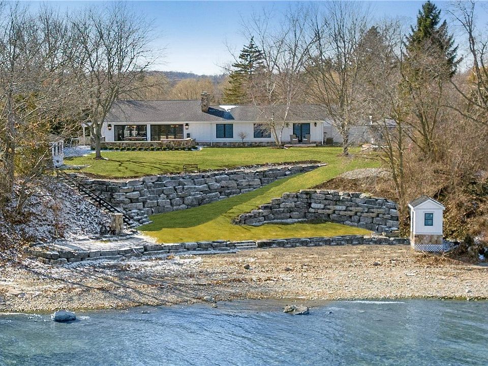 Find your center and escape from the everyday when you step into this completely renovated (2021) lakefront property featuring 125’ of private Owasco Lake frontage, custom dock, new retaining wall, and extraordinary fixtures and finishes indoors and out. Enjoy spectacular outdoor entertaining on the stone terrace featuring built-in grilling station; relax in the gazebo; or take your boat or jet ski out onto the water for sensational outdoor adventures. Every done-for-you detail has been considered for your comfort and convenience, with updates and upgrades including new roof, siding, driveway, mechanicals, radiant heating, flooring, doors and windows, fully renovated kitchen, baths, and lower level media room. Fabulous kitchen features custom cabinetry, marble countertops, farmhouse sink, gourmet appliances including La Cornue gas range, copper pot filler. Primary suite features dedicated terrace plus en suite bath with mother-of-pearl tiles and steam shower. Downstairs gathering space includes media room, kitchenette with walk-in pantry, guest room, home office and full bath. Love the location close to Finger Lakes wineries, restaurants and the renowned Merry-Go-Round Playhouse.