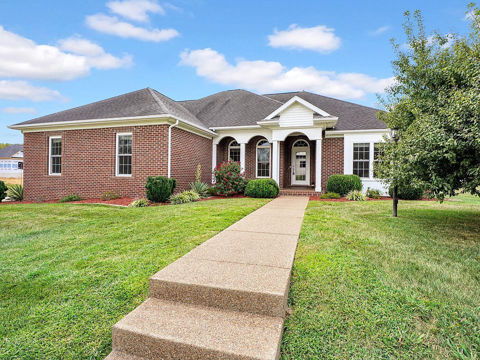 Next Home, Next Adventure! FAR ENOUGH out to be peaceful, CLOSE ENOUGH to be convenient - just 15 minutes from Gateway Hospital and 45 minutes to Owensboro. Set on a large corner lot in an upscale rural subdivision, this 4-bedroom, 3-bath home offers TWO spacious EN SUITE bedrooms—the primary on the main level DEFINES suite with an OVERSIZED walk-in closet, garden tub, & double vanity, while another UPSTAIRS with its own HVAC controls offers a retreat all its own. Bright & AIRY, lovely light HARDWOOD floors and brand-new carpet pair perfectly with rich wood cabinetry and eye-catching crown molding throughout. A tray ceiling expands the living room while a cozy gas FIREPLACE and substantial mantel anchor and invite. The gourmet kitchen overlooks the private backyard and features a THERMADOR gas range, stainless steel appliances, and NEW refrigerator. A stylish home office with FRENCH DOORS once served as a formal dining room and is perfectly poised to a room of requirement. Recent UPGRADES include a whole-home Generac GENERATOR (2025), new water heater, pressure regulator, sump pump, and a full professional deep clean. With a fully fenced backyard, large patio, 2.5-car garage, sprinkler system, and ULTRA-LOW HOA, this home offers comfort, style, and a great floor plan for Work-From-Home/Study-At-Home. For your confidence & convenience, this home has been PRE-INSPECTED — No Surprises! (Full Report Available). Seller is also offering the buyer a 1-yr Home Warranty with $100 Lock & Key Reimbursement, for additional PEACE of mind.
