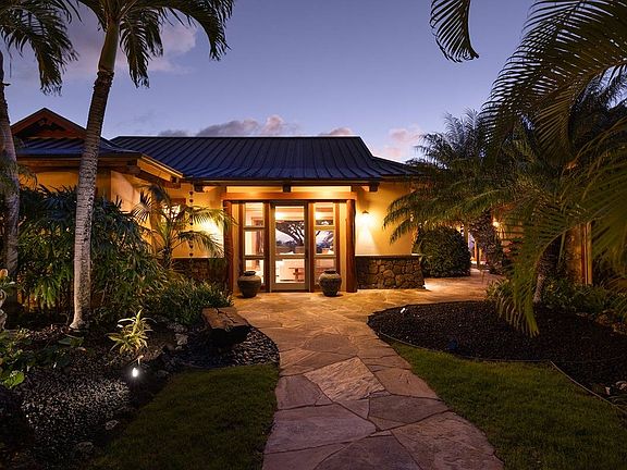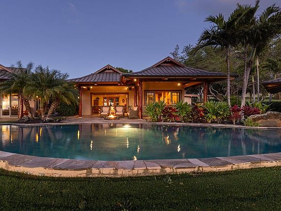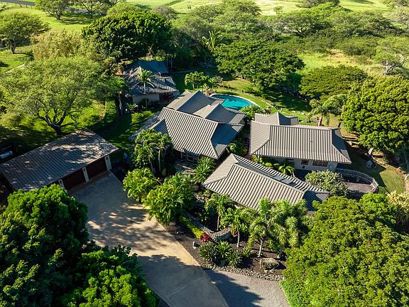 Situated on 21+ fully fenced acres of mature landscaping provides incredible privacy for this pod-style enclave. Consisting of four detached, air conditioned, living areas nestled within a tropical island setting, the architecture is modern, island ranch-style with large roof overhangs, a stucco exterior and partial lava wainscoting. An expansive covered lanai and gas firepit, ideal for outdoor living, dining, and entertaining overlooks a heated pool and the spectacular ocean, year-round sunsets, and Maui views. Feel the magic!