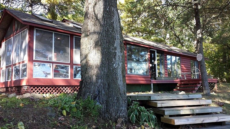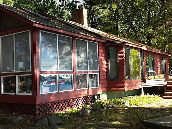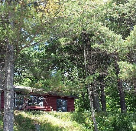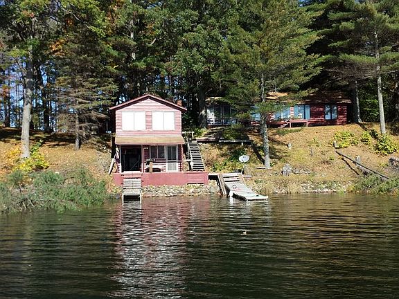 Lakeshore cabin on 265 feet of shoreline on 2.8 acres. Very private amongst the pines and oak trees. A great property to add on more square footage to existing structure, but comfortable as is. Enough land to build another structure and use existing cabin as a guest house. Wild life abounds. Property includes boathouse 16ft x 16ft (2 story) at the lake edge with sleeping for six; it is grandfathered in. Lower level has sleeping accommodations on one side/storage on other. It has a poured foundation on three sides with wood front construction. Large sliding windows access view of lake from upper sleeping portion. Cabin is south facing with 12 x 14ft porch accessed by French doors from main living area to watch and enjoy all the wild life/such as eagles, fox and more. Acreage at 2.8 is wooded with approx. 3/4 acre lawn. White pines planted in 1952 and many oaks over 90 years old. Cabin is half log, poured foundation, brick fireplace with Heatilator insert for cozy fall fires, updated and well kept. New roof in 2004 on all three structures/cabin, boathouse and double car garage. Well and septic in good condition. Selling furnished, including aluminum dock.