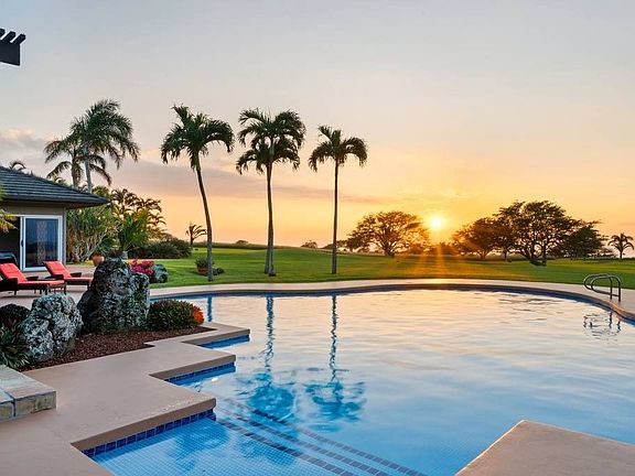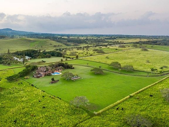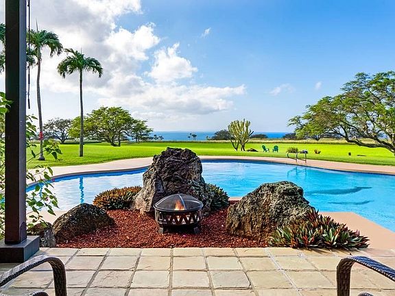 Grand Hawaiian Estate magnificently situated in a resort-style setting on 10.8 acres in a private Gate-Guarded Community. Drive into the large park-like setting with manicured lawns and well-established drought-resistant plants and trees. The home faces due west with expansive views of the Pacific, Maui and occasionally Lanai and Kahoolawe. This is the highest elevation on the ranch creating a spectacular vista with unobstructed views. Three Bedroom, 3 and a half bath main house with spectacular views from every room. A spacious great room with 30' ceiling, a lava rock wall that frames the wet-bar, a lava rock fireplace and hardwood floors. The perfect place for family gatherings, entertaining and relaxing. The great room opens to a covered lanai with plunge pool and looks out on the swimming pool and the Bocce Ball Court and Horseshoe Pit beyond. Luxurious master suite, with champagne/coffee bar, under-counter refrigerator, soaking tub, walk-in shower with views to Maui, small office area and walk-in closet with custom built-ins. The master has its own private lanai with an outdoor shower and tub built into the weeping rock wall feature, and a fire pit creating a private retreat for morning coffee, watching the whales breach or enjoying the night skies. Upstairs are two generously sized en-suite bedrooms, connected by a large covered lanai perfect for evening cocktails and a sunset view. The kitchen has been completely renovated with all new appliances, blue pearl waterfall-end island and gas cooktop with BBQ area just outside. The guest hale has 2 bedrooms each with its own water closet and vanity, a kitchenette & huge walk-in shower, and ocean views. This home has been tastefully renovated to include painting, cabinetry, counters, carpet, bathrooms, ceiling fans appliances, fixtures and much more. Arrange your private viewing & come live your best life in your very own private resort. https://my.matterport.com/show/?m=TTsZtScWCP4&brand=0