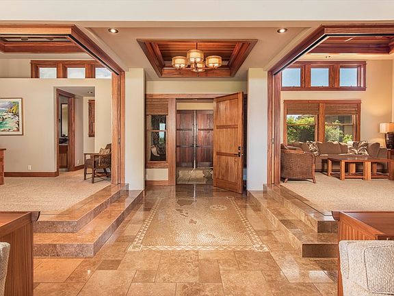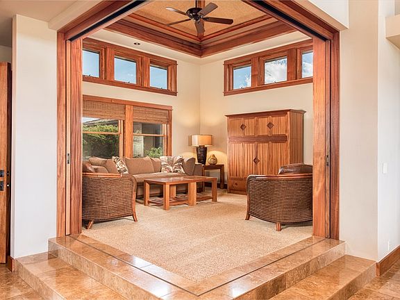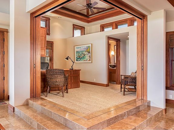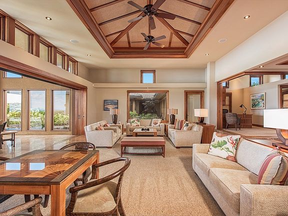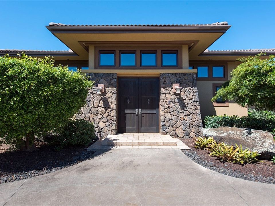 Custom Hawaiian Contemporary at Puakea Bay Ranch on over 10 acres, sweeping Ocean, Maui and sunset views, full architectural, landscape and luxuriously designed interior program, with rich use of African Mahogany thru-out, stone counter-tops, travertine floors, first time offered for sale, completed in 2007-2008, 4 bedroom all with en-suite baths, gourmet kitchen, large lanai, custom pool with spa/reef, large boat barn with 13.5' tall doors complete with shop, this estate is very private, and you must see to appreciate. This well-priced offering surely will not last long as this is a real jewel along the Kohala Coast.